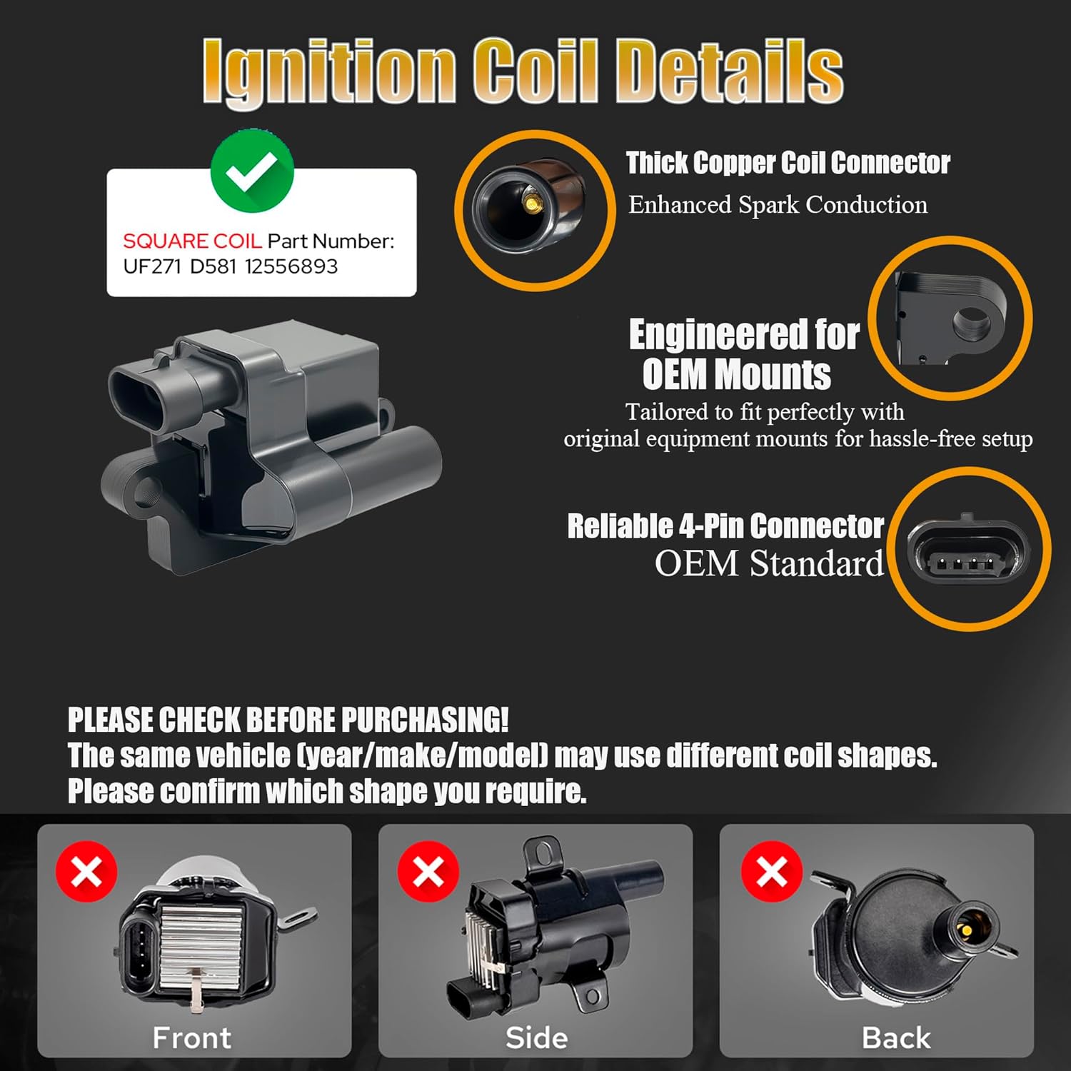 | Included Components | 8SET UF271 Square Ignition Coils Pack & Double Iridium Spark Plugs & Spark Plug Wires |