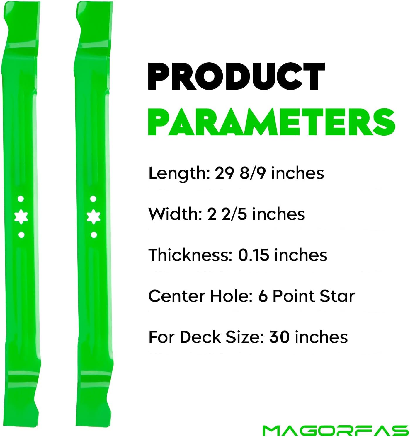 SPECIFICATIONS:Length: 29 8/9 inchesWidth: 2 2/5 inchesThickness: 0.15 inchesCenter Hole: 6 Point StarFor Deck Size: 30 inchesReplaces Part Numbers Fit for:Cub Cadet 942-04385 742-04385Compatible with:For ColumbiaCR30 Neighborhood Rider, CR30HFor CraftsmanE150, R-1000, R-105, R-110, R-140, R-1500, RER1000For Cub CadetCC 30 H ydro Mini Rider 2022, CC30 Hydro Mini Rider, CC30 Mini Rider, CC30e Electric Mini Rider, CC30E lectric Mini Rider 33BA27JDB10 Lithium Ion, CC30H Hydro Mini Rider, CC30H Mini RiderFor MurrayAll-Rider LT-30, Mini-Rider LT-30For Troy-BiltTB30, TB30B, TB30E, TB30R, TB30R Hydro, TB30R Neighborhood RiderFor Yard-MachinesLT-30Our high-quality control standards and high-quality manufacturing materials guarantee every cut for you