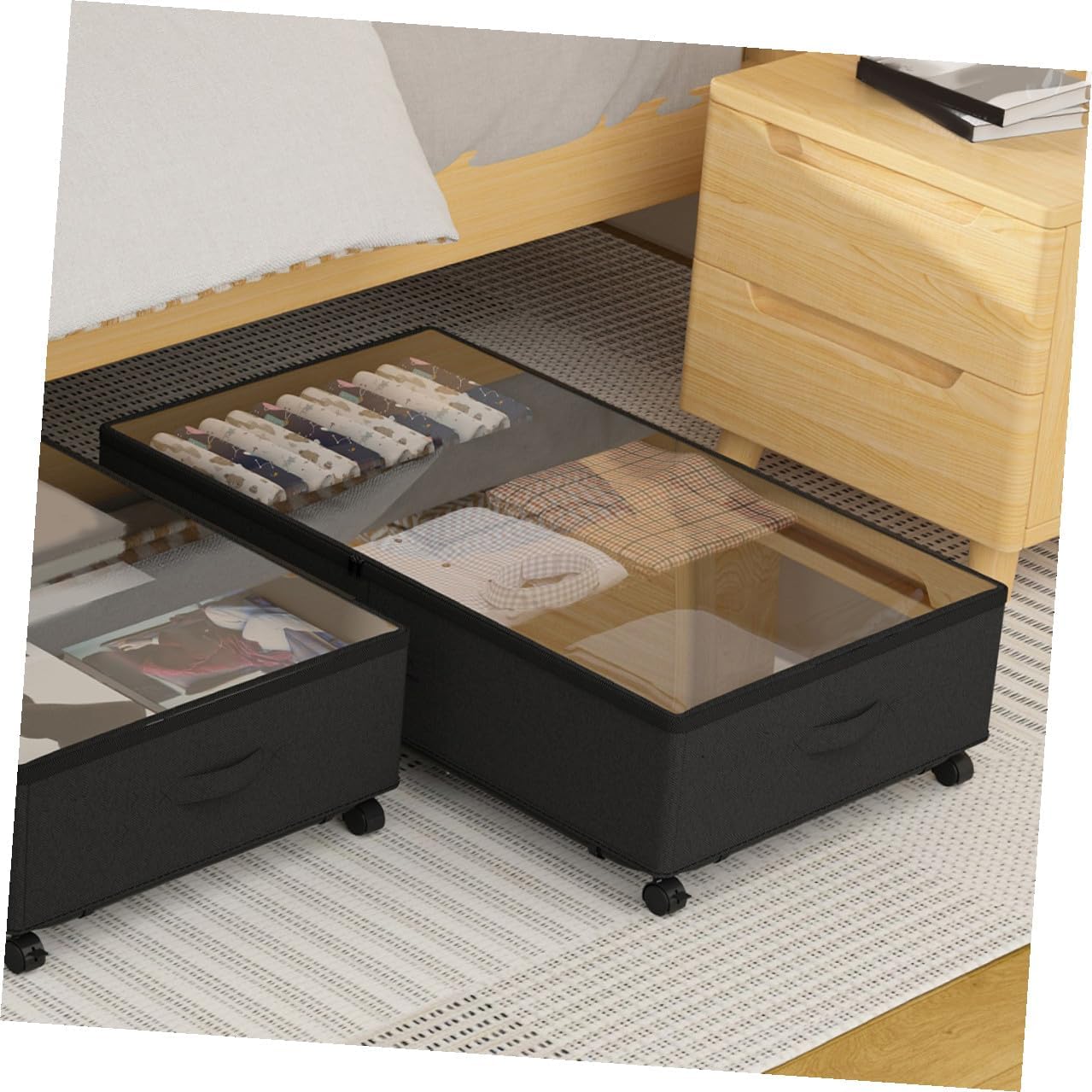 Package List 1 x Under Bed Storage Bag Features -Size:80.00X42.00X16.00cm/31.44X16.51X6.29in -Material:ABS, oxford cloth, iron -Color:Black -Product Info:Under-bed storage truck -Smooth sliding functionality: easily move and access your stored items with the wheels storage for under bed. - Window design allows you to see what is in the bag and where it is, easily find what you are looking for with ease underbed storage boxes. - Easy to clean, simply wipe down your storage bags with a damp cloth and let dry large capacity clothes storage bag. - This practical storage bag is suitable to be used to store quilts, blankets, clothes, etc underbed storage container. - The organizer storage box with wheel is made of ABS, oxford cloth, iron that is strong and does not warp, providing effective protection for your clothing wheel design Storage Bag.Goods Descriptionstorage under bed with wheels It owns a simple and practical appearance design.storage bin under bed The under-bed storage bag can maximize under-bed space.under-bed storage Then, you can choose our under bed storage bin.under bed clothes organizers As the increase of the number of daily necessities, you must need a nice-looking storage bag at home