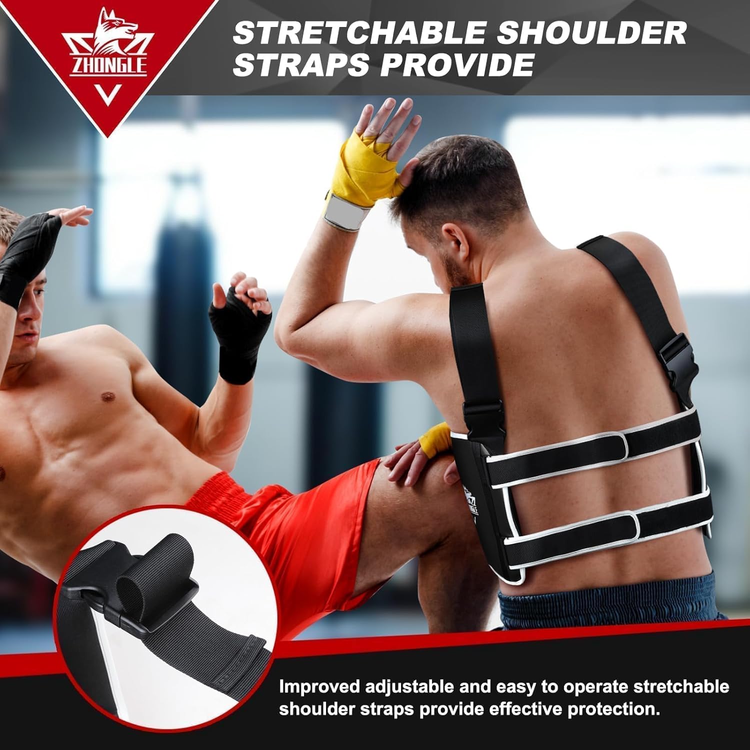 Professional-grade protection for combat sports. Features a durable PU leather shell with multi-layer EVA foam and spongia padding for optimal shock absorption. Equipped with adjustable shoulder straps and dual Velcro straps for a secure, customized fit. Available in S, M, L sizes to ensure maximum mobility and safety