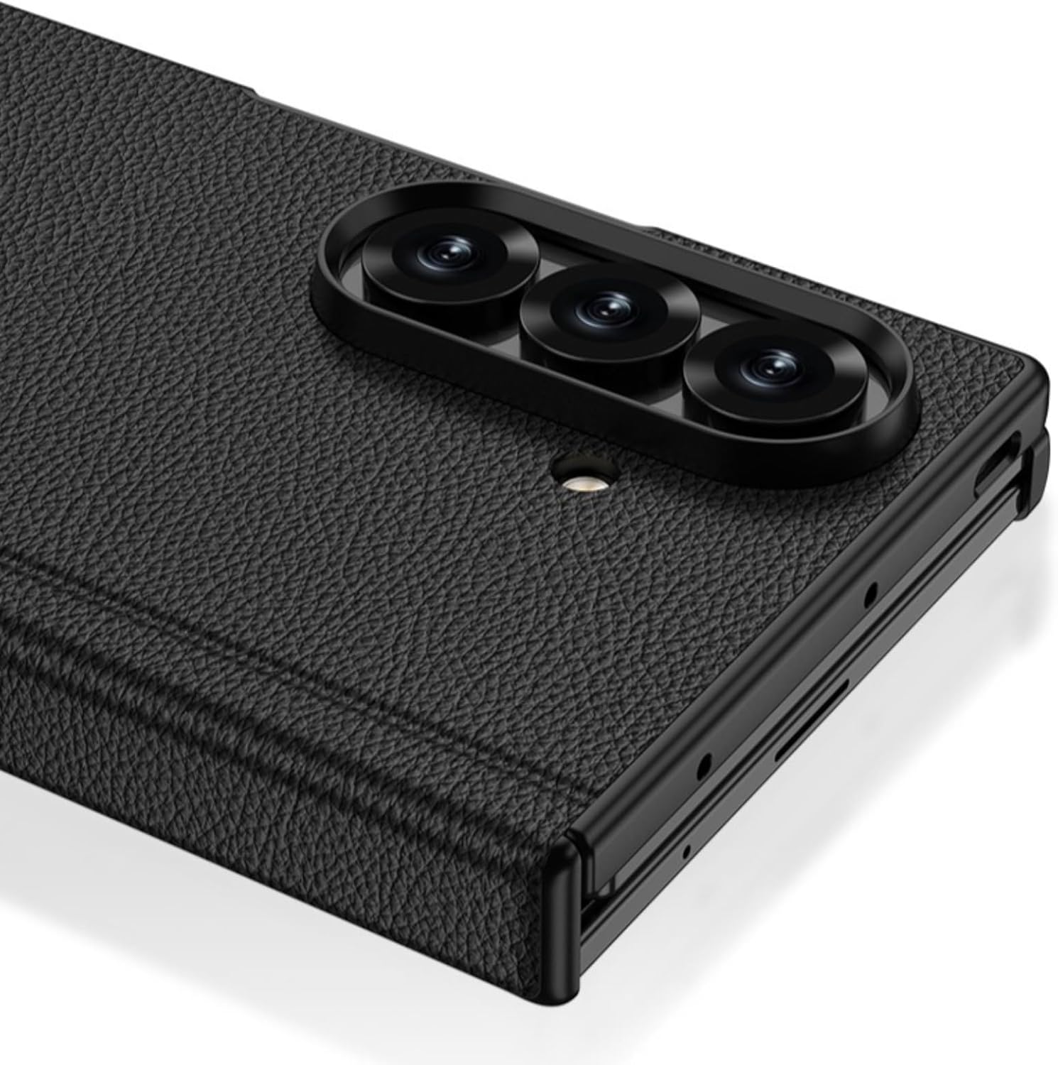 Protect your Galaxy Z TriFold in style with our premium shock-absorbent phone case, designed to combine durability with sleek aesthetics. This slim fit case offers a perfect balance between protection and a lightweight design, ensuring your device remains comfortable to hold while staying safeguarded from daily wear and tear. The leather-textured finish not only adds a touch of elegance but also provides a secure grip, reducing the risk of accidental drops. Engineered with built-in hinge protection, this case ensures the delicate folding mechanism of your Galaxy Z TriFold remains shielded from impacts and scratches. The innovative rotating stand feature allows you to prop up your phone at multiple angles, perfect for hands-free viewing whether you're watching videos, video calling, or working on the go. The sturdy stand is seamlessly integrated into the case, offering convenience without adding bulk. Crafted from high-quality materials, this case delivers superior shock-absorbent properties to absorb and disperse impact energy, keeping your device safe from bumps and drops. The precise cutouts provide easy access to all buttons, ports, and features, while the raised edges protect your screen and camera from scratches when placed flat.