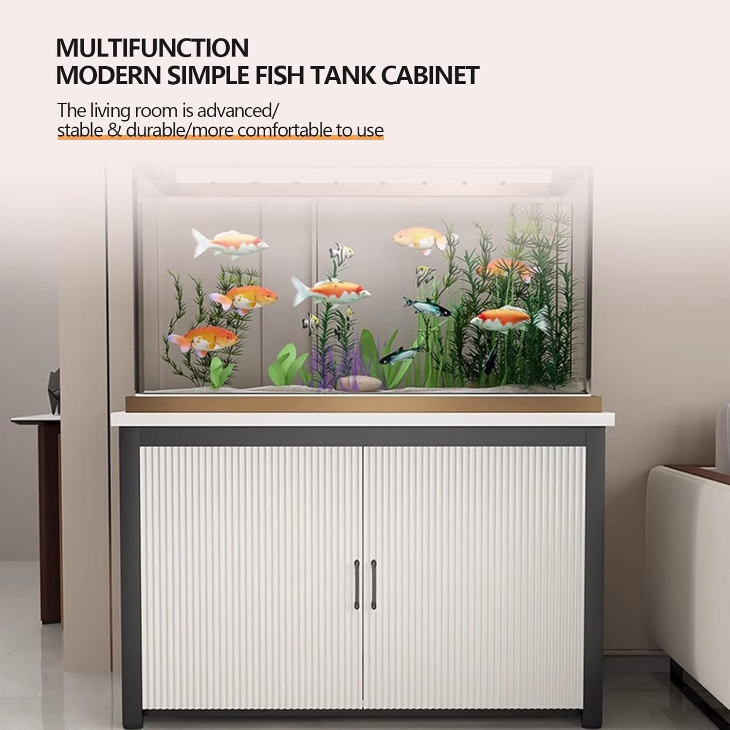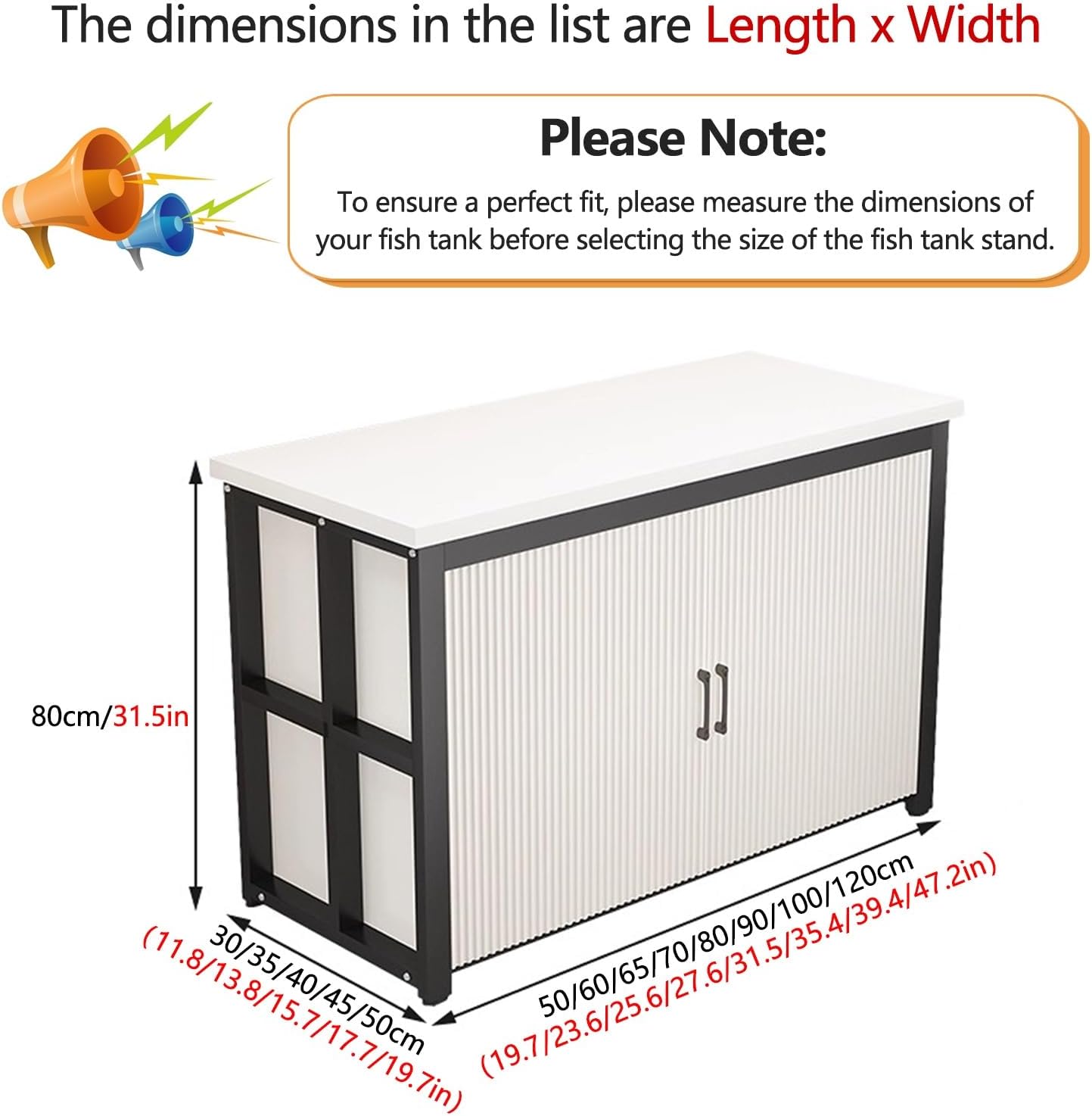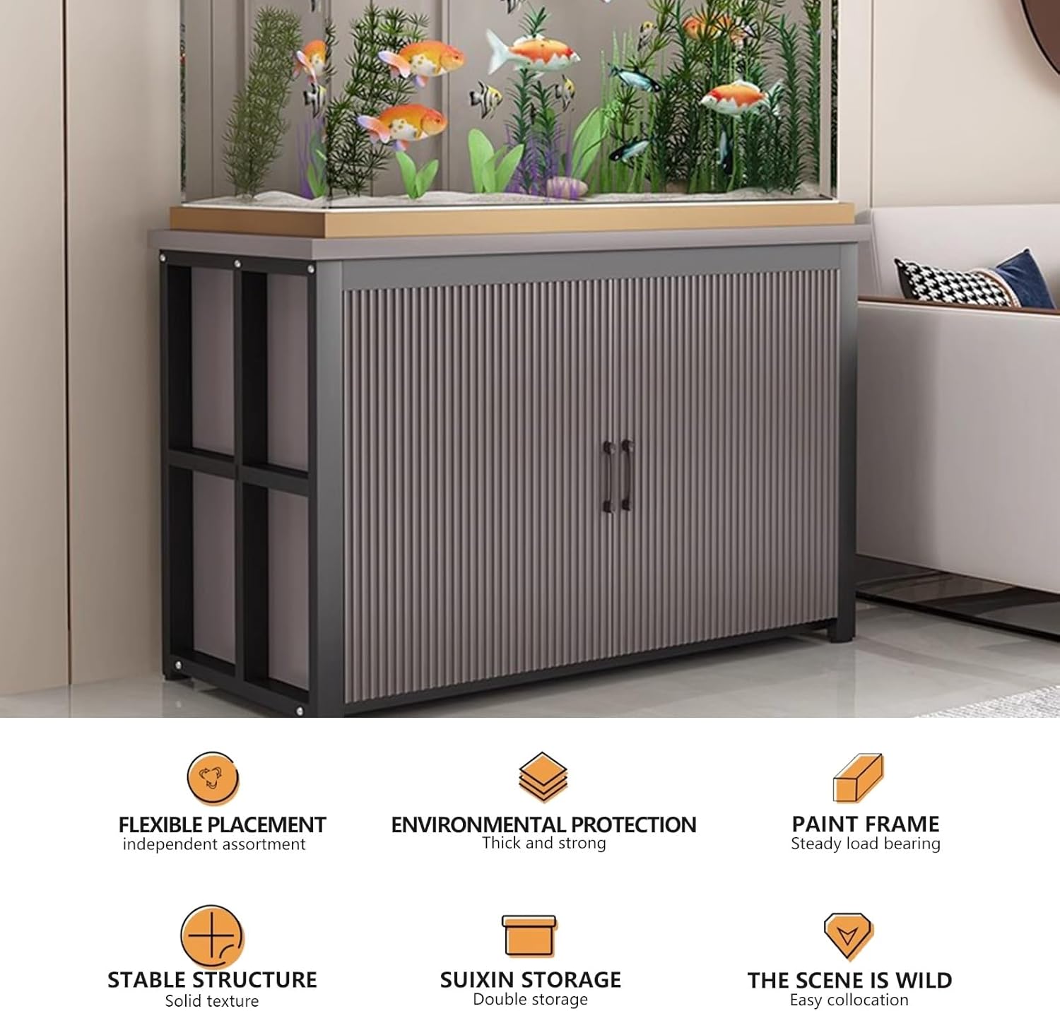 Thickened baked enamel carbon steel frame + side reinforcement beams, stable load-bearing and not easy to shake.Open countertop + closed storage cabinet, 100/120cm model with built-in vertical board for placing fish tank supplies/miscellaneous items.Standard eco-friendly board, odorless, easy to clean, high brightness, and not easy to deform.Anti-slip, noise-reducing footpads that protect floors and minimize noise.Smooth, durable hardware hinges/handles for silent opening and closing.Product SpecificationsName: Fish Tank StandMaterial: Carbon steel frame + eco-friendly boardLength: 50/60/65/70/80/90/100/120cm (19.7/23.6/25.6/27.6/31.5/35.4/39.4/47.2in)Width: 30/35/40/45/50cm (11.8/13.8/15.7/17.7/19.7in)Height: 80cm/31.5inAssembly Required: YesPackage Contents1 x Aquarium Stand (aquarium not included)Please NoteThis product supports customization; please feel free to contact us at any time.Hand-measured dimensions may have slight discrepancies; please understand.Due to differences in screen display effects, colors may vary slightly; the actual product prevails.