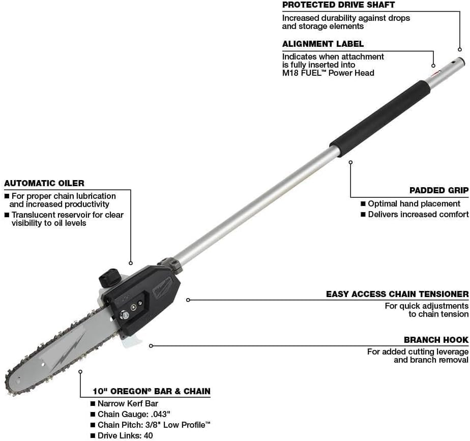 The for Milwaukee. M18 FUEL QUIKLOK edger attachment has an 8 in. blade and high strength guard for increased durability. The edger includes mud flaps to prevent dirt kickback as well as a skid plate to protect the gearbox from concrete contact. The adjustable wheel allows for setting an optimized blade depth and tool angle for maximum control. The for Milwaukee. M18 FUEL QUIKLOK articulating hedge trimmer attachment's articulating mechanism allows for 270° rotation of the blade set, which offers 13 operating positions and 1 storage position. The hedge trimmer attachment has a 20 in. blade with 1 in. cut capacity, clearing more material in a single pass. The hedge trimmer head includes a tip guard to prevent damage to the blade and surrounding work area, as well as a padded grip for optimal hand placement and increased comfort. The for Milwauke M18 FUEL QUIKLOK 10 in. pole saw attachment has a 10 in. Oregon bar and chain which delivers smooth and fast cuts with minimal kickback. The pole saw attachment has an automatic oiler for proper chain lubrication, easy access chain tensioner for quick adjustments to chain tension, and a branch hook for added cutting leverage and branch removal. for Milwaukee. M18 FUEL QUIKLOK 3' attachment extension is powered by the M18 FUEL power head with QUIKLOK and is compatible with the QUIKLOK 10 in. pole saw and articulating hedge trimmer attachments. The extension attachment provides 3' of additional length for applications requiring further reach. The attachment has a padded grip providing increased comfort. The extension's QUIKLOK coupler has a positive locking mechanism and alignment guide allowing for quick attachment changes. SPECIFICATIONS Brand Name for Milwaukee. Package Contents (1) 49-16-2718 M18 FUEL QUIKLOK Edger Attachment, (1) 49-16-2719 M18 FUEL QUIKLOK Articulating Hedge Trimmer Attachment, (1) 49-16-2720 M18 FUEL QUIKLOK 10 in. Pole Saw Attachment, (1) 49-16-2721 M18 FUEL QUIKLOK 3 Ft. Attachment Extension Package Depth 60 Package Height 24 Package Weight 32 Product Condition New Warranty Type Limited