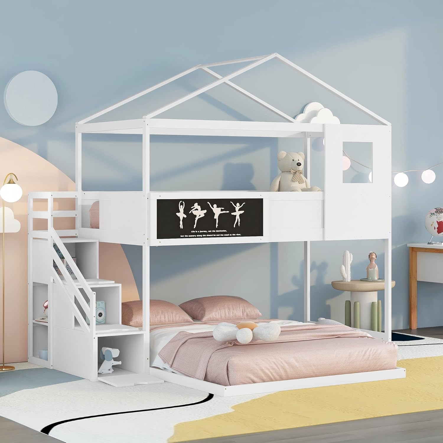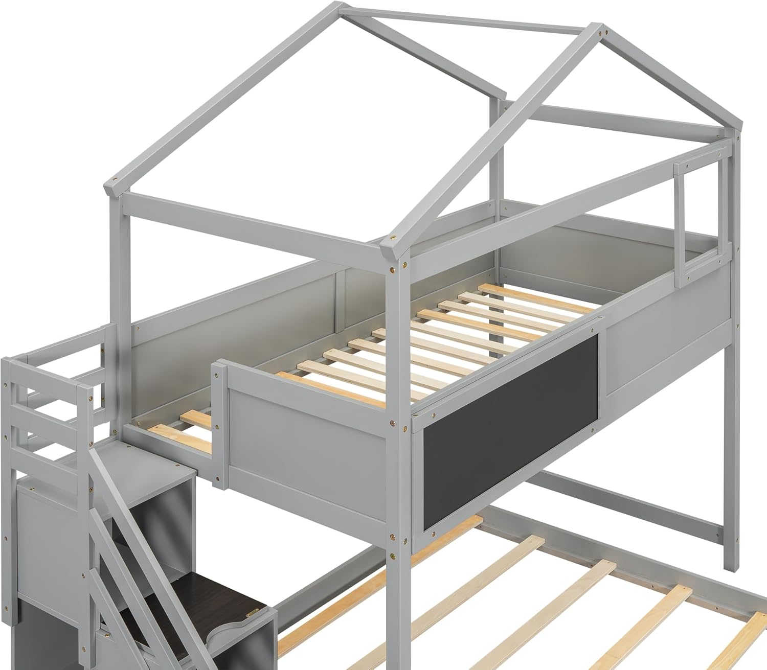 Twin Over Full Bunk Bed with Storage Stairs, House Bunk Bed with Blackboard ,Roof & Window, Wooden Floor Bunk Beds for Girls Boys Take your bedroom to the next level with this twin over full bunk bed that not only saves space, but creates an exciting atmosphere for you. Features a classic house roof shape that will inspire your imagination, and you can decorate the blackboard and for the bed shape,you can pretend it’s a fortress, giving full play to imagination. The bunk beds with built-in stairs instead of a ladder for easy access to the top bunk ,and there is 3 drawers built into staircase which can effectively save your space, perfect for store quilts, bed sheets and other necessities. Weight & Dimensions Overall Product Dimension: 94.4''L*77.4''W*86.9''H Upper Bed Dimension:76''x38.2'' Down Bed Dimension:76''x54.5'' Detail Product Dimension:Please refer to the Size image Number of Upper/Down Bed Slats:14/7pcs Number of Package:2 Overall Product Weight:199lb Weight Capacity Upper bed: 300LBS Bottom bed:350LBS Recommended Mattress Thickness Upper bed: 6-8'' Bottom bed: 8-10'' Specifications: Product Type:Bunk bed Size:Twin/Full Color:Gray/White Product material: Pine Wood+MDF Assembly Required:Yes Kindly Notes: Manual measurement has been used,there may be some reasonable error. All the pictures are taken by actual samples, slight chromatic aberration may occur due to lighting or display.