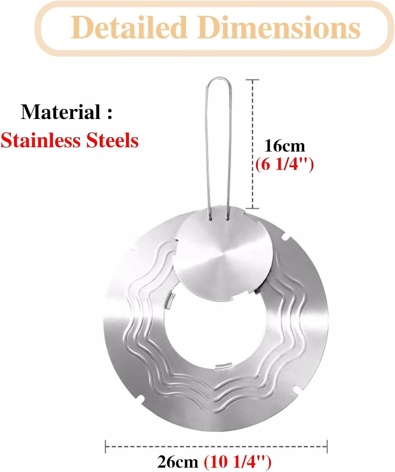 ◆ The removable heat diffuser can be used with any type of pot to meet all your cooking needs and is the ideal accessory for any kitchen.◆ Package Contents:- 1 × Heat Diffuser for Gas Stove Top◆ Specification:- Material : Stainless Steel- Color: Silver- Purpose: Heat Conduction + Thawing- Diameter : 26cm (10 1/4")◆ Feature: - Prevent cooking utensils from being blackened.- Can be used in one piece or separately.- Defrost food quickly without heating.- Easy to clean, disassemble and store.- Suitable for quick frying and stewing.- Prevent cooking utensils from being blackened.- Durable stainless steel material for long-term use.- A great kitchen partner gift for a friend.◆ Warm Tips:- Ideal for gas and electric stoves. Not intended for induction stoves.- Please wait for the heat diffuser to cool down before cleaning, Do not use sharp tools or corrosive detergents. And do not put in the dishwasher.- Don't touch it with your hands while using it. Be careful of burning your hands. (Use handle to pick it up)◆ Efficient Customer Service:- In the process of receiving or using the product, if you encounter any problems, please feel free to contact us. We value your comments and offer nice solution for you.