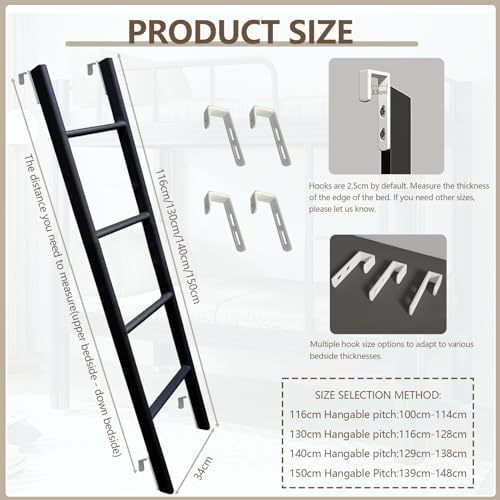 Introducing our versatile climbing bunk ladder, designed to seamlessly integrate into various home decor styles. Whether you’re looking to enhance your home, office, or school dormitory, our loft bunk ladder is an ideal choice for maximizing space and functionality. **Specifications:** - **Material:** Durable Wrought Iron - **Overall Width:** 34 cm (13.3 inches) - **Overall Height Options:** 116 cm (45.6 inches), 130 cm (51.1 inches), 140 cm (55.1 inches), 150 cm (59 inches) - **Load Capacity:** 150 kg (331 lbs) **Key Features:** Constructed from high-quality metal, this bunk ladder offers exceptional stability, ensuring safety for your family. The adjustable hook positions allow for customization based on your specific needs, making installation straightforward and efficient. By utilizing a hanging installation method, this ladder saves valuable floor space, making it perfect for smaller rooms. With our climbing bunk ladder, your family can independently access their beds, promoting convenience and comfort. It’s not just a functional addition; it’s a stylish enhancement to any living space. **Package Includes:** 1 x Bunk Ladder (with 4 Hooks and Screws) **Important Notes:** 1. Please measure the height of your bed and the thickness of the bedside before purchasing. 2. Our hooks come in a default size of 2.5 cm; if you require a different size, please contact us. 3. Minor measurement errors may occur due to manual measuring. 4. Should you have any questions before or after your purchase, our customer service team is here to help. Elevate your living space with our climbing bunk ladder—where style meets practicality!