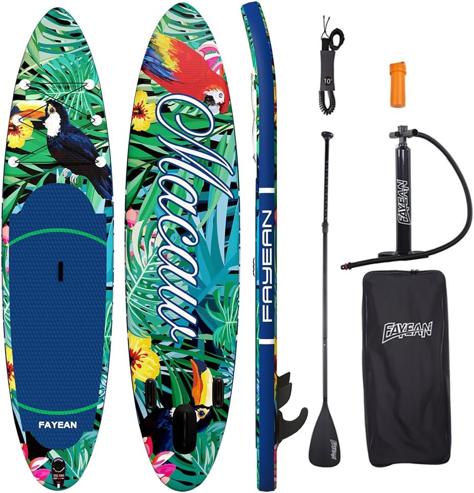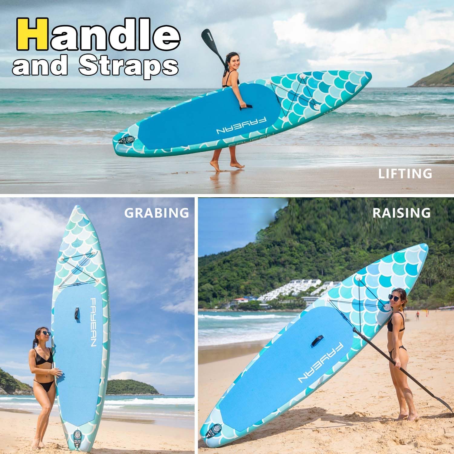 Specification Dimension: 11''x33"x6" ; Board Weight: 20.5 lbs Rider Weight: Up to 450 Pounds - Experienced riders may exceed this weight 3 Removable Fins - provides the board extra stability, perform well in surf and flat water 6" Thickness - makes it much more stable and stiffer versus the typically 4" thick models Super Stable - easy to ride. Provide good balance between stability, perfect choice for beginners and casual riders Durable & Resistant - reinforced composite drop stitch core inside, high grade PVC double layer construction , making it substantially stronger than a rigid board and virtually indestructible Feature 4 Points Mounted Bungee High quality bungee on the front deck, you can grab it to keep safe. It also provides enough space for storage to secure all your gear. Perfect for fishing, touring, snorkeling, spear fishing or recreational paddling. Heavy Duty Built in Carrying Handle Enter and exit the water with all your gear on your SUP with ease. The carry handles are conveniently located at the middle of the board. It's convenient for you to carry and use the paddle board. Portable & Compact It quickly inflates or deflates for easy storage, making it ideal for the lake, river or ocean. When deflated, the board can be rolled up to a small size roll. Can be tucked in your car and easily store in a closet. Accessories Included Comes with paddling essentials, including a coiled ankle cuff safety leash, oar, manual air pump, repait kit, waterproof phone case and convenient storage bag