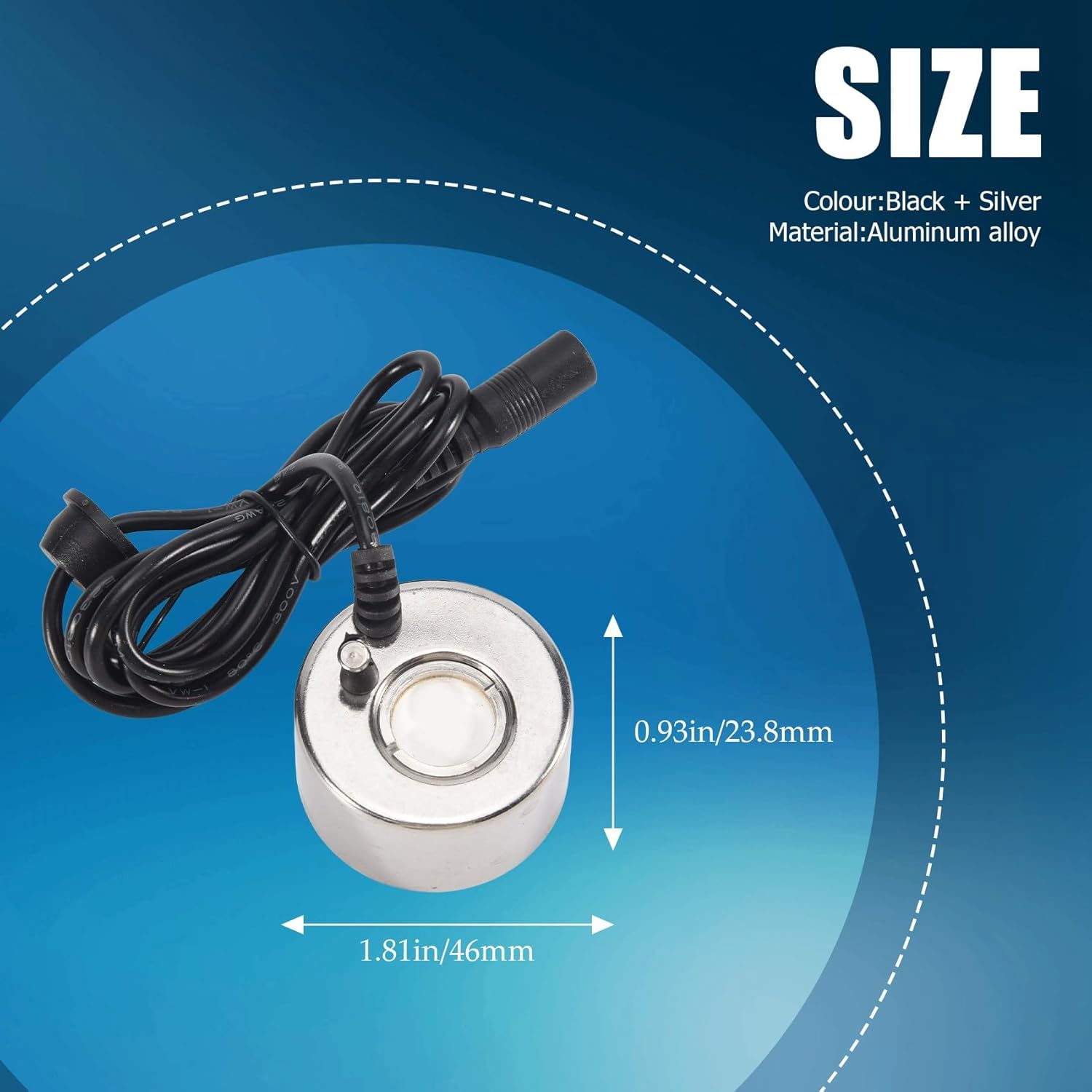 Hubceuo Plug Type: US Plug,it applies to Canada, India, Japan, Mexico, Thailand, Taiwan, the , the Philippines and so on.ParametersInput voltage: AC100-240vOutput voltage: DC24vMaximum fog-making efficiency: 20 oz/h/Colour:Black + SilverMaterial:Aluminum alloySize:46x23.8mmBest water depth: 1.6-3 inchPackage Contents:3* atomizing heads1* adapter(With US Plug)[Notice]The principle of mist maker is ultrasonic vibration, so there be splashes when using.Only the above package content, other products are not included.Note: Light and different displays may cause the color of the item in the picture a little different from the real thing. The measurement allowed error is +/- 1-3cm.