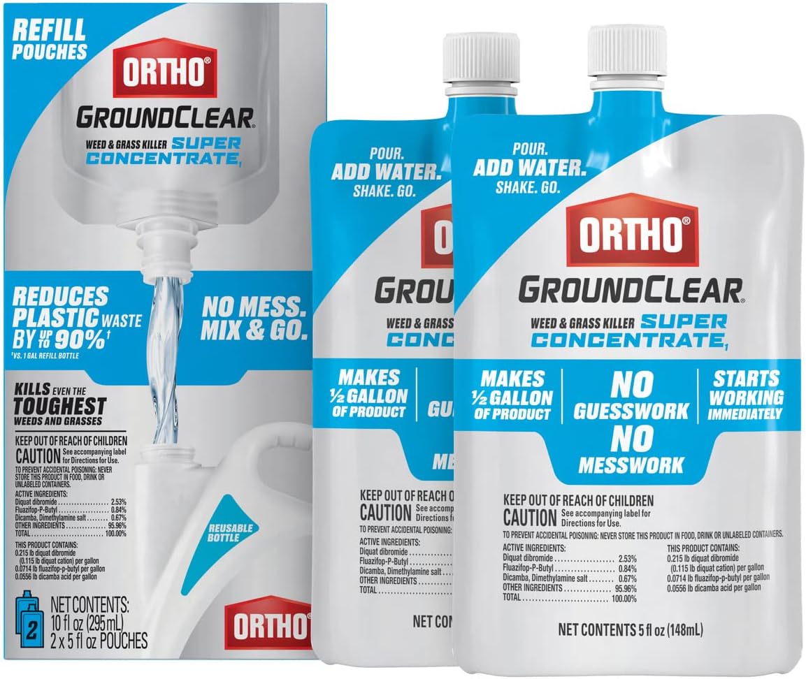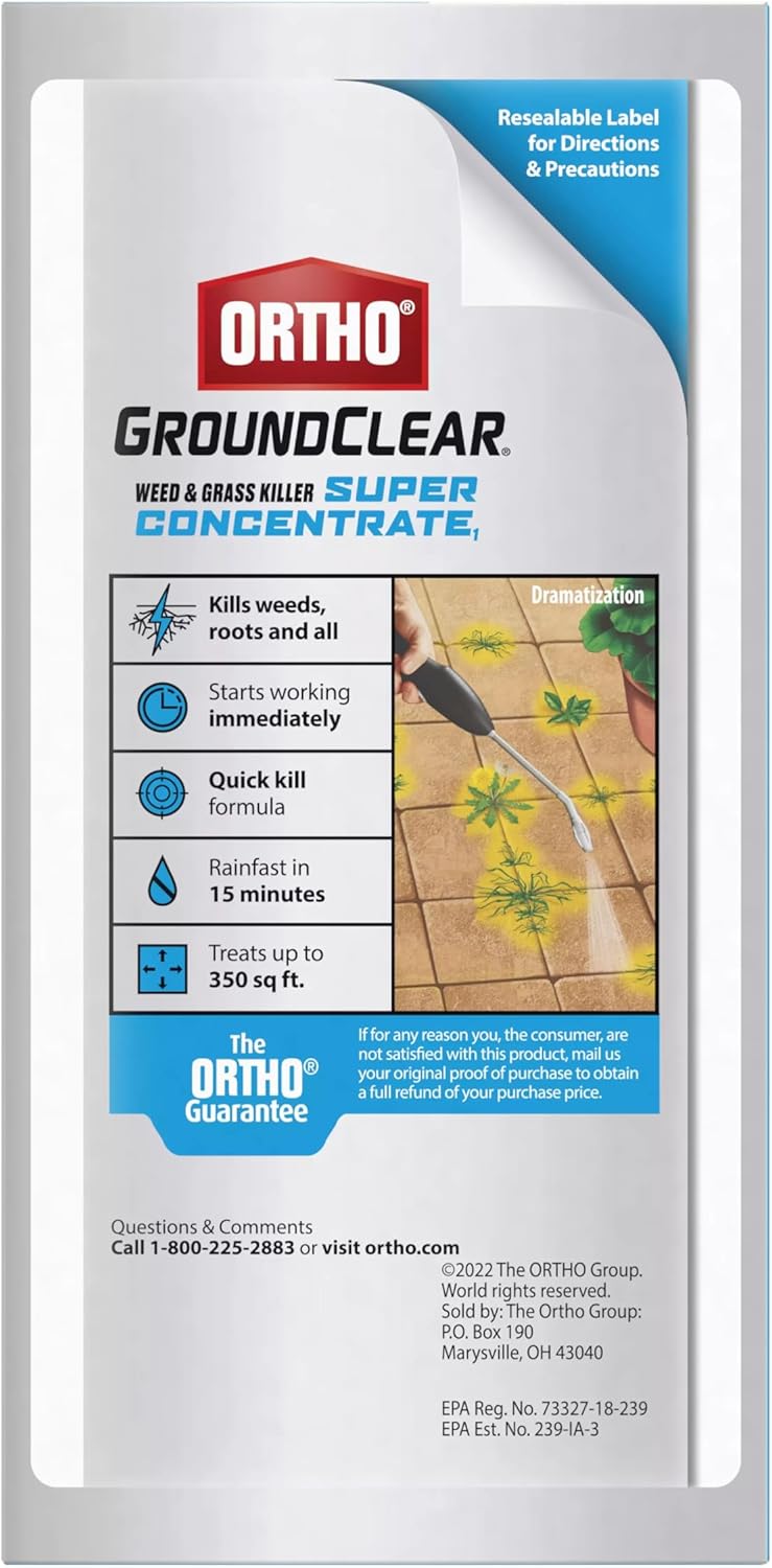 Ortho GroundClear Weed and Grass Killer Super Concentrate1 kills the toughest weeds and grasses to the root, providing broad-spectrum control of weeds and grasses for hardscape and landscape maintenance with ingredients that work on contact. Ortho GroundClear Weed & Grass Killer Super Concentrate1 is ideal to use for weed control around perennial landscape plants, shrubs, trees, in gravel or mulch beds, patios, and for clearing walkways and driveways. To use this grass and weed killer concentrate: 1) Unscrew cap from pouch and empty entire pouch into a reusable Ortho bottle or tank sprayer 2) Fill bottle or tank sprayer with 0.5 gallon of water 3) Securely screw cap onto bottle or sprayer 4) Shake gently 5) Spray as directed. One 0.5 gallon refill pouch covers 175 sq. ft. Spray only the weeds that need killed by thoroughly wetting the foliage to cover, but do not spray to runoff. Apply when weeds are actively growing and when the air temperature is above 60°F with calm air. See visible results within hours after application, with complete kill in 1-2 weeks. A single application controls most listed weeds and grasses.