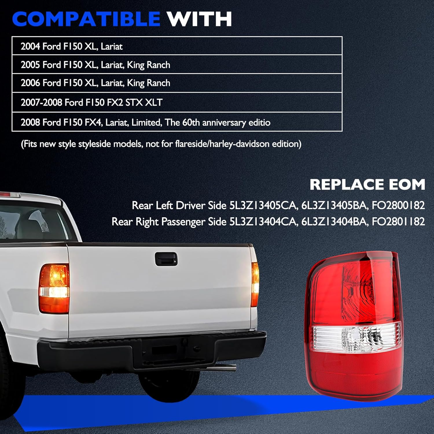 • Precise Compatibility - The rear tail lights pair precisely compatible with 2004-2008 Ford F150/XL/XLT/FX2/FX4/STX/Lariat/Limited/King Ranch/The 60th Anniversary Editio