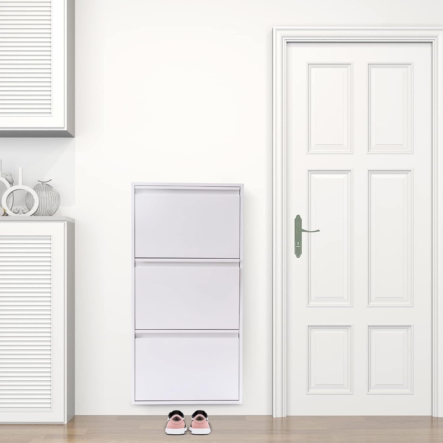 DescriptionDo you believe that? A small entryway can be turned into a storage treasure trove. If you don't believe it, you can try our shoe cabinet. The three-tier design of this shoe cabinet can hold up to 9 pairs of shoes and the wall-mountable installation can save more space in your entryway. Hurry up and take it home with you!Key FeaturesOrganized Lifestyle: This shoe cabinet cleverly integrates shoe storage into life, placing it at the doorway to store your messy shoes, making it pleasing to the eyes as soon as you open the door, bringing you an organized lifestyle.Thoughtful Design: Each layer is equipped with a damping switch and rubber magnetic suction, which not only reduces noise and prevents your hands from being injured when opening and closing, but also enhances the sealing of the shoe cabinet.Tipping Bucket Design: The entire shoe cabinet features a tipping bucket design for easy opening and closing, making it very easy to use. It also keeps dust out of the shoe cupboard.Space Saving: With a small footprint of 19.88*4.8inch at the bottom, it can be placed in every corner of the home. By using the doorway space wisely, even a small entryway can be turned into a storage treasure trove. Also, it can be mounted on the wall to save floor space.Easy to Clean: Its smooth surface makes it very easy to clean, all you need to do is wipe it down regularly with a dry cloth or wash away any serious stains. And the shoe cabinet is held in place with spring pins and is removable for easy cleaning.Avoiding Creases: This large capacity shoe cabinet can accommodate boots and medium boots, allowing them to stand securely or be placed at an angle to avoid wrinkles on the surface.Protective Shipping: In order to prevent the product from being damaged and bumped during transportation, we fill the package with anti-collision protection foam to protect your products to the maximum extent possible.DetailsReinforced Shoe Hopper: The shoe hopper is reinforced on three sides, making it stable to open and close without wobbling.Top Platform: The top platform is spacious enough to hold keys, photo frames, etc., making it very practical. Pre-drilled Holes: There are four pre-drilled holes at the back of the shoe cabinet to allow you to fix the cabinet to the wall and prevent it from collapsing.Full Plate Layer: The layer rack is designed with a full plate, which can effectively prevent the ash on the bottom of the shoes from falling onto the shoes on the lower layer. At the same time, the full plate layer shelf places shoes more stably, and even high heels will not fall.Concealed Handle: The concealed pull handle is semi-circular. The curved shape is not only subtle and beautiful but also makes it easy to open and close the shoe cabinet without hurting your hands.ApplicationIt is suitable to be placed at the door, living room, or bedroom used to place slippers, casual shoes, high heels, boots, leather shoes, and other shoes, as well as some daily necessities such as keys, books, and umbrellas. It can be used as a bookshelf and storage rack.Installation1. Place the shoe cabinet in the position where it is to be installed.2. Mark the hole locations with a marker.3. Punch the holes in the marked positions.4. Insert the plastic expansion tube into the punched holes.5. Screw the screws into the plastic expansion tube (halfway in first). 6. Align the shoe cabinet with the screw fixing holes and hang it. 7. Tighten the screws so that the back of the shoe cabinet fits snugly against the wall.8. Check that the shoe cabinet is not loose.SpecificationStyle: ModernColor: WhiteShape: RectangularNumber of Tiers: 3Installation Type: Freestanding, Wall MountedMaterial: Cold Rolled SteelPlate Thickness: 0.8mm/0.03inchGross Weight: 13.5kg/29.76lbsProduct Size: 50.5*12.2*103.3cm/19.88*4.8*40.67inchPackage Size: 115*59*19cm/45.28*23.23*7.48inchPackage Included1* Shoe CabinetOther Accessories for InstallationNotes1.Please note that this is a slim shoe cabinet that can accommodate shoes up to 4.72inch in height and 12.2inch in length.2.Please allow the slight color difference caused by the shooting light and 1-3cm error due to manual measurement, and make sure you do not mind before ordering.