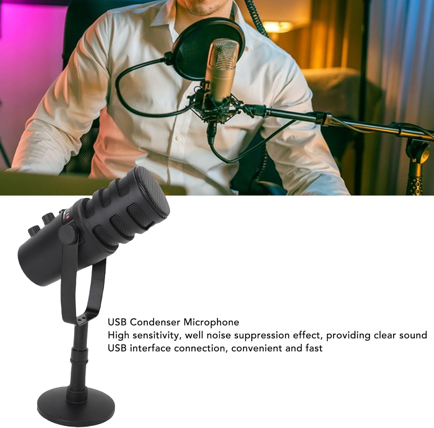 1. [Condenser Microphone] The condenser microphone features high sensitivity and well noise suppression effect, providing clear sound, ensuring enhanced user experience. 2. [Easy USB Connectivity] The condenser microphone can be easily connected to your device such as PC, mobile phone through USB interface, plug and play, convenient and fast. 3. [Wide Application] Our USB microphone is lightweight and portable, easy to set up, suitable for various devices such as computers, laptops, smartphones, tablets, etc. 4. [Versatile Usage] The USB PC mic can be used for various applications, such as gaming, live streaming, podcasts, karaoke, etc., to meet user needs. 5. [Long Lasting] Made of ABS material, our USB condenser microphone is not easily damaged, ensuring long lasting use, with a large base, can be stably placed on the desktop. Specification: Item Type: USB Condenser Microphone Material: ABS Use: PC, Laptop, Smartphone, Tablet How to Use: Open to use. PackageList: 1 x USB Condenser Microphone 1 x Base 1 x Screw 1 x Data Cable 1 x Manual
