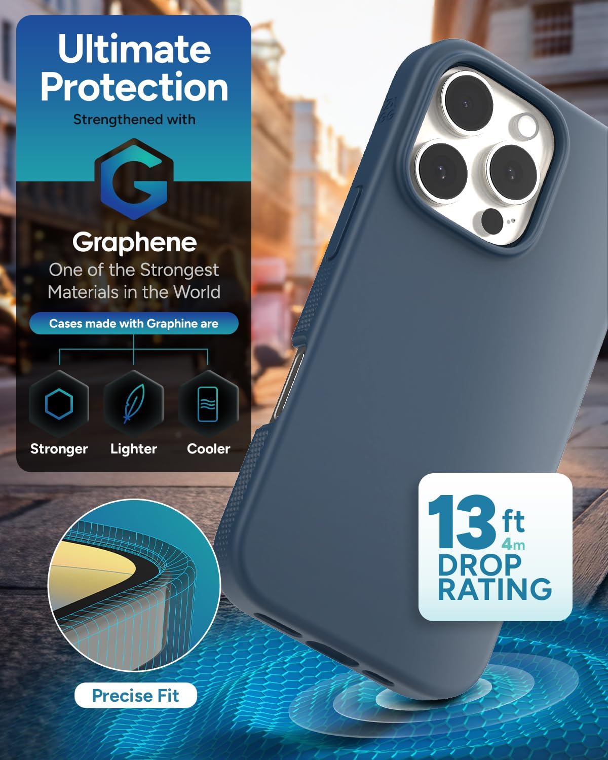 The ZAGG Manhattan Snap case is designed to meet the needs of today’s modern, eco-conscious iPhone user. Offering premium protection and style, this case is compatible with the iPhone 16 Pro and provides up to 13 feet of drop protection, tested to meet rigorous Mil Std 810G 516 standards. Whether you’re on the go or just living your day-to-day life, this case will keep your phone safe from accidental drops and impacts.What sets the Manhattan Snap apart is its graphene reinforcement—a groundbreaking material that’s stronger than steel but more elastic than rubber. This technology ensures that your phone is protected without the bulk, so your device remains slim and easy to carry. The soft-touch silicone surface and textured sides offer a secure grip, making it comfortable to hold for hours, and preventing it from slipping through your fingers.Designed for the environmentally conscious, this case is made with up to 96% recycled materials, verified by an independent third party, making it as sustainable as it is strong. Plus, it’s compatible with MagSafe and most wireless chargers, allowing you to charge your phone without removing the case. Choose the ZAGG Manhattan Snap to protect your iPhone while showcasing your style and commitment to sustainability.Backed by ZAGG’s limited lifetime warranty, this case offers long-term protection and peace of mind for as long as you own your iPhone 16 Pro. Don’t wait—experience the perfect blend of strength, style, and sustainability today. Key Features: 13ft (4m) Drop Protection, certified to Mil Std 810G 516 standardsGraphene reinforcement for ultimate strength and durabilityMagSafe and wireless charging compatibleSoft-touch silicone surface for a secure, comfortable gripEco-friendly, made from 96% recycled materialsSlim, pocket-friendly designLimited Lifetime Warranty