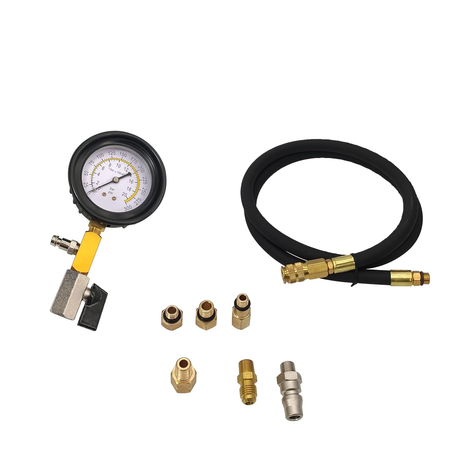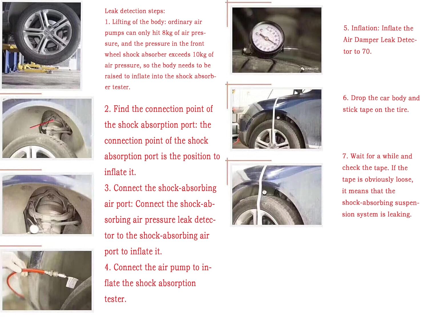 Leak detection steps: 1. Lifting of the body: ordinary air pumps can only hit 8kg of air pressure, and the pressure in the front wheel shock absorber exceeds 10kg of air pressure, so the body needs to be raised to inflate into the shock absorber tester. 2. Find the connection point of the shock absorption port: the connection point of the shock absorption port is the position to inflate it. 3. Connect the shock-absorbing air port: Connect the shock-absorbing air pressure leak detector to the shock-absorbing air port to inflate it. 4. Connect the air pump to inflate the shock absorption tester. 5. Inflation: Inflate the Air Damper Leak Detector to 70. 6. Drop the car body and stick tape on the tire. 7. Wait for a while and check the tape. If the tape is obviously loose, it means that the shock-absorbing suspension system is leaking.